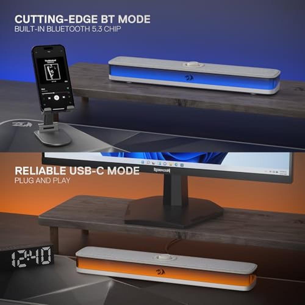Indulge in immersive audio with the Redragon GS515 RGB Desktop Soundbar, expertly crafted for premium desktop audio experiences. As a top-tier choice for high-end desktop audio solutions, this 2.0 channel stereo soundbar delivers crystal-clear sound and vibrant RGB lighting. With the latest BT 5.3 technology and convenient USB-C/USB powered connectivity, you can easily pair your device and enjoy seamless music streaming. Whether you're looking for superior desktop speakers or a high-performance desktop soundbar to elevate your computer audio, the GS515 is an excellent option. Its sleek gray design complements any upscale desktop setup, making it a perfect addition to your home or office. The Redragon GS515 RGB Desktop Soundbar is designed to provide an ultimate audio experience, with advanced features such as wireless connectivity and a sophisticated design. Experience the best of desktop audio with the Redragon GS515 RGB Desktop Soundbar, a top-of-the-line choice for those seeking premium sound quality and exclusive design.