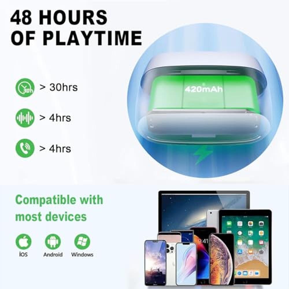 Indulge in the ultimate wireless audio experience with our ear Bluetooth earbuds, expertly designed to deliver seamless connectivity and exceptional sound quality. Our ear Bluetooth headphones boast advanced Bluetooth 5.4 technology, ensuring stable and efficient pairing with your iPhone or Android device. With 4 ENC noise-cancelling microphones, you can enjoy crystal-clear calls and immersive hi-fi stereo sound. Plus, our ear Bluetooth wireless earbuds offer an impressive 48-hour playtime and are built with IPX7 waterproof protection, making them perfect for workouts, commutes, or everyday use. Whether you're looking for a premium audio experience or a reliable companion for your daily activities, our ear Bluetooth earbuds are the perfect choice. Experience the future of wireless audio with our cutting-edge technology and superior sound quality.