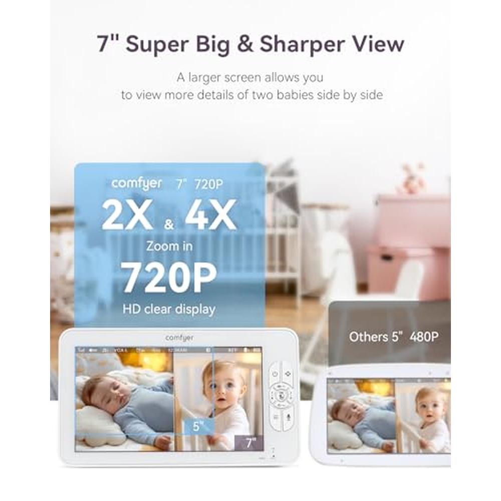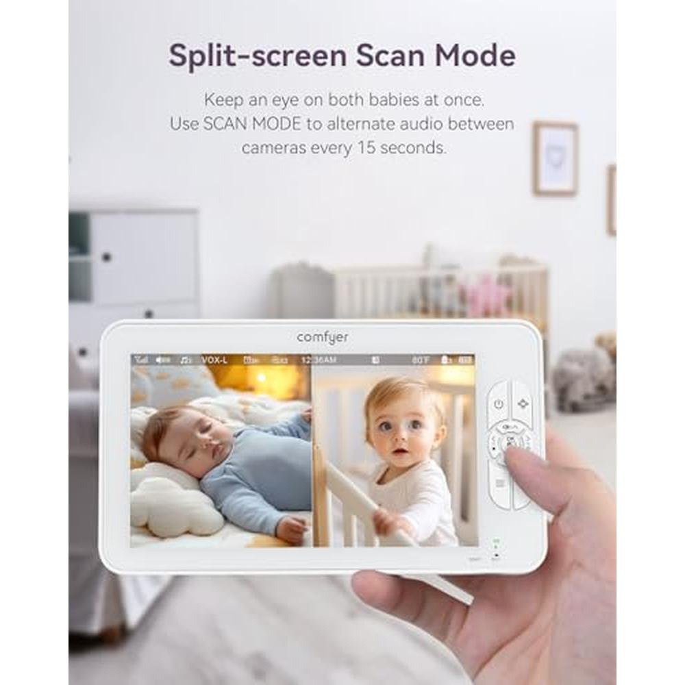- Take Care of Two Babies with Split Screen: comfyer baby monitor with 2 super clear 1080P cameras allows you keep an eye on both babies at once on a single 7" 720P HD screen, while the audio focus remains on one camera at a time, ensuring clear and uninterrupted listening. Plus, with SCAN mode, effortlessly alternate audio between cameras every 15 seconds, ensuring you never miss a moment from either camera. You can connect up to 4 cameras to the same Display Unit.