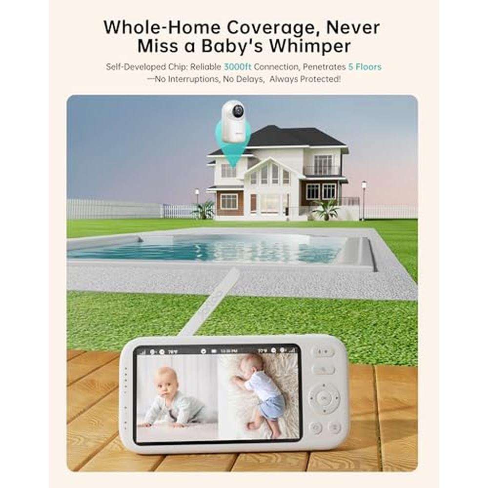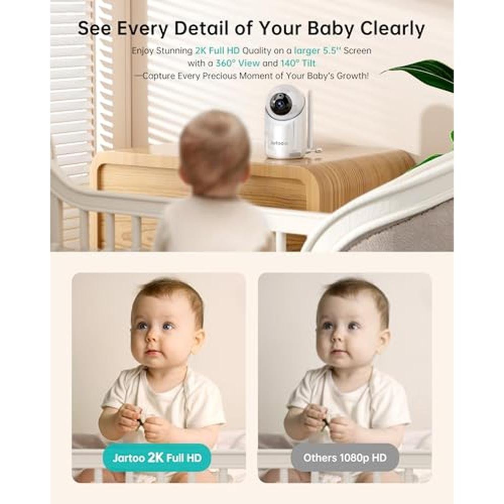 • [No Details is Spared with 360 Degree View] Equipped with 2K camera, 5.5" IPS LCD screen and 360 degree Pan & Tilt & Zoom, Jartoo video baby monitor gives you over four times more resolution than others with incredible details, ensuring no important moments or changes is missed. With vibrant and natural color calibration, the baby camera monitor delivers lifelike images and videos with real colors, allowing to observe kid's condition and surroundings with accuracy and confidence.