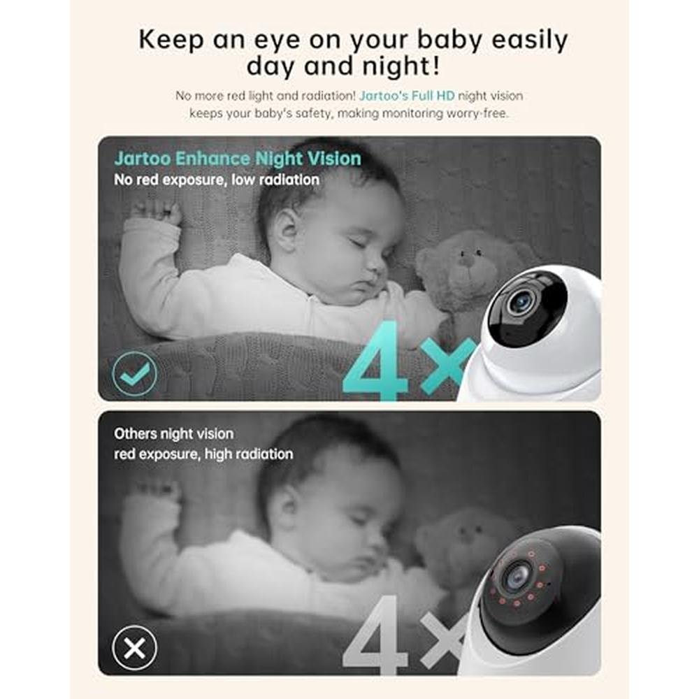 • [Timely Show Up When Baby Cries ] With exclusive smart AI cry-sensor technology, Jartoo baby monitor with camera and audio aims to be your parenting assistant, extra eyes on your baby while you getting sound sleep, providing you reliable notifications without false alarm. By adding video baby monitor with camera and audio to your list of nursery must-haves,you and your family will easily restore the pace of life in the living room, kitchen, bedroom, basement and yard with full peace of mind.