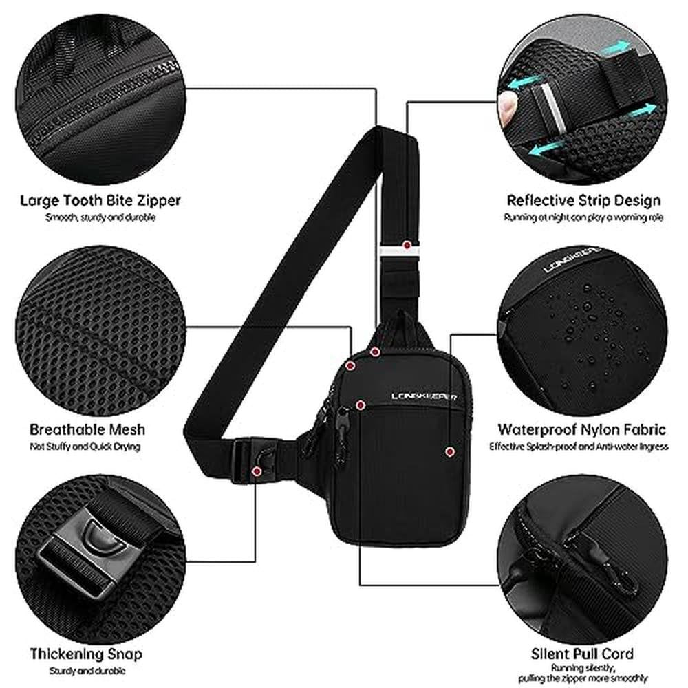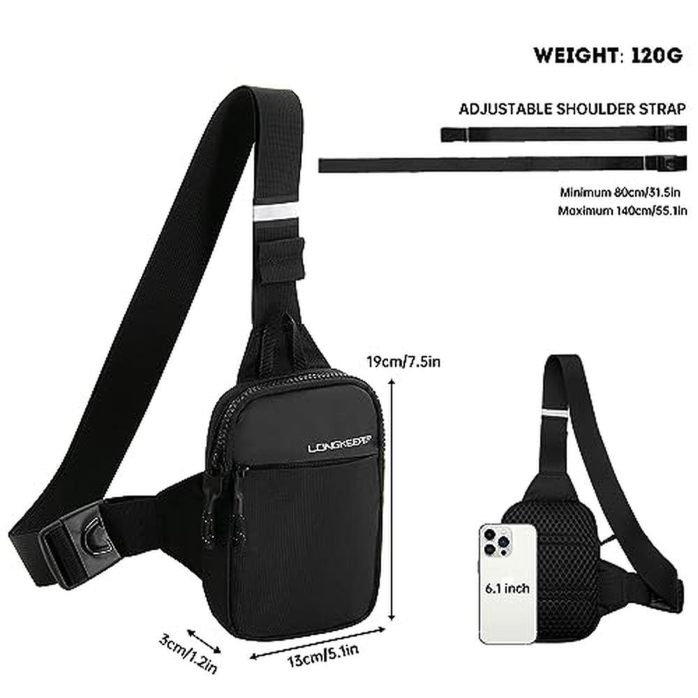 • Small Crossbody Bag: This chest bag has 1 main zipper pocket and 1 front zipper pocket. The main zipped pocket contain 1 inner mesh pocket. Enough capacity to hold ID cards, cell phone, keys, cash, passport, earphones, etc. Very spacious for organizing your personal belongings when traveling and daily use.