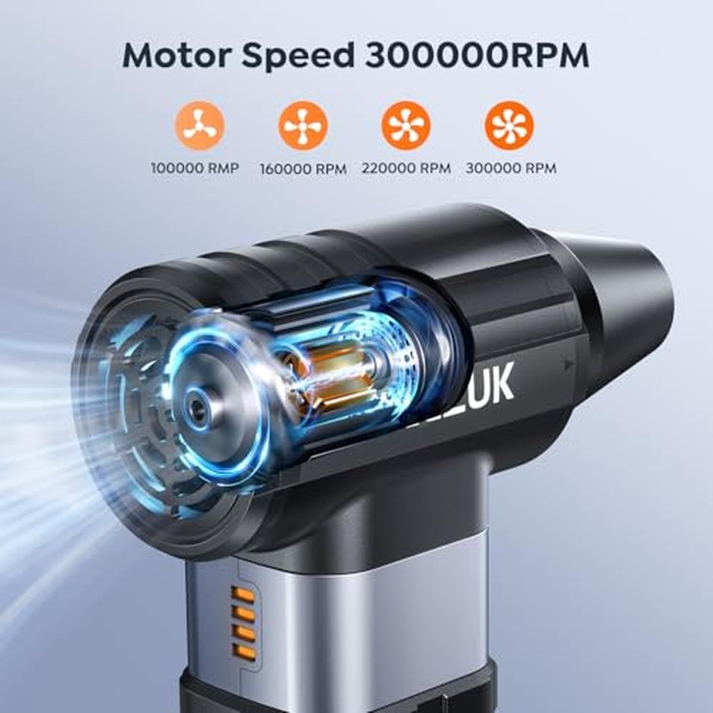 - Ultra-High Speed & Adjustable Power: Experience unmatched cleaning performance with our electric air duster featuring a powerful 300,000 RPM motor. The 4-speed adjustable settings (Low/Medium/High/Turbo) allow you to customize the airflow for delicate electronics, stubborn dust, heavy-duty cleaning tasks or inflate your air mattress. Perfect for keyboards, PCs, laptops, car interiors, and more !