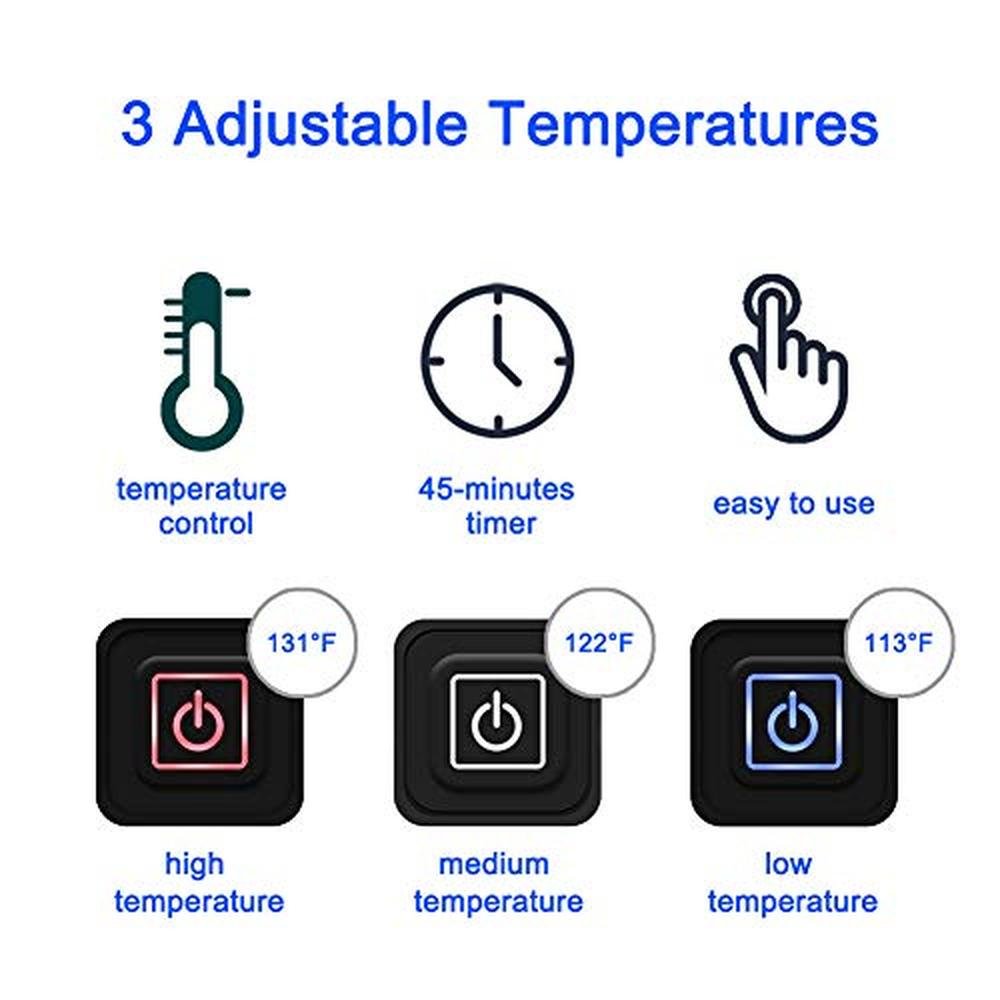 - [3-LEVEL HEATING] This foot warmer provides 3 Level heating, you could select High / Medium / Low level by switching one silicone button. Three heating temperature is: high 131/55C show with red light; medium 122/50C show with white light; low 113/45C show with blue light. The auto-off feature would cut the power off after 45minutes or overheating.