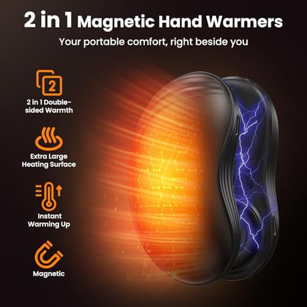 Indulge in the comfort of our 2-in-1 Electric Hand Warmers rechargeable, designed for daily use and providing dependable warmth whenever you need it. Ideal for commutes, outdoor events, or relaxing moments, they offer a simple way to keep your hands comfortable. With 360-degree warmth that adapts to you, the hand warmer is magnetically designed to connect with its pair, surrounding your hands with warmth. The larger heating surface provides more consistent heat, and you can use them connected, hold one in each hand, or share one with a companion for flexible warmth anywhere.