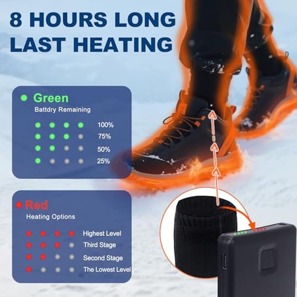 • Pocket-Sized Fireplace: Our electric heated socks comes with a pair of 5000 mAh power banks slip discreetly into side pockets, delivering 38 hours of heat on demand. Four quick-tap levels (95F to 149F) let you dial the perfect temperature for ski lifts, office chairs, or midnight walks with the dog. Our heating socks are perfect for skiing, hiking, cycling, or outdoor work, theyre your go-to winter essential