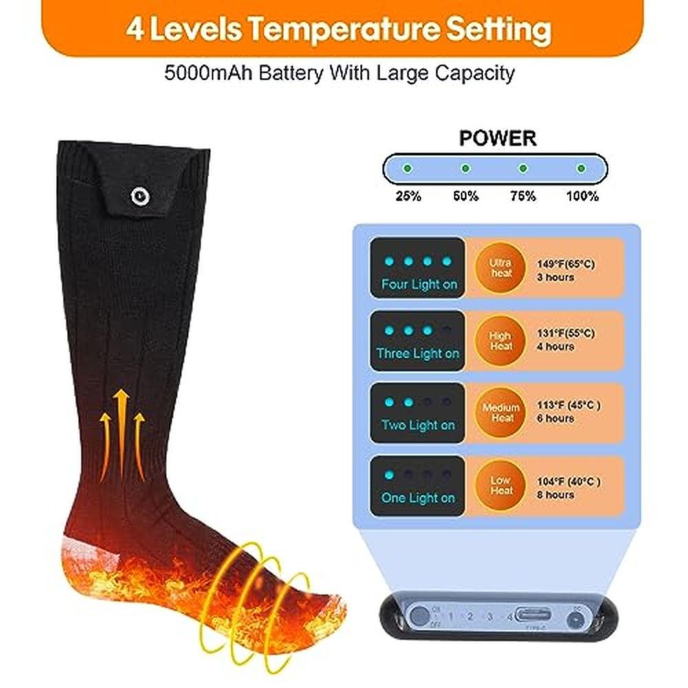 - 4 Levels Temperature Controller:The winter socks have 4 levels setting heat controller, you can easily adjust the comfortable temperature by short press the temperature setting button. There are Ultra high heat (65C/149F, 3 hours ,4 indicator lights on), high heat (55C/131F, 4 hours ,3 indicator lights on),medium heat (45C/113F, 6 hours,2 indicator lights on), and low heat (40C/104F, 8 hours 1 indicator lights on)