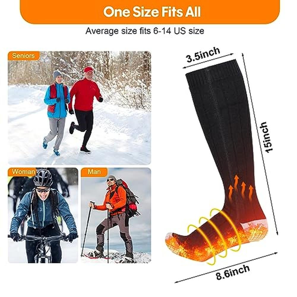 - Soft Comfortable & Warm Heated Socks:Combined with ergonomic design. So it's absorbent, breathable, quick-drying, durability and elasticity. This rechargeable heated socks are designed for men and women, one size fit all, suitable for 6-14 Size. Suitable for all kinds of indoor and outdoor activities, such as skiing, fishing, hunting, cycling, hiking, running, shoveling snow, outdoor working, etc. The winter warm socks are your best choice
