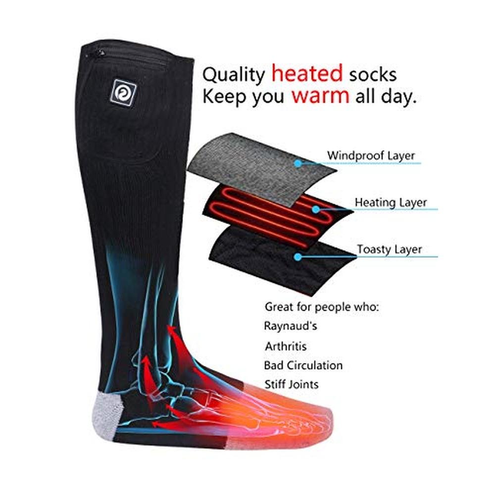 Quality Heated Sock with excellent heating elements and imported material.Challenge the climate,be freedom in your gorgeous life. ItemRechargeable Heated Socks Men Women UnisexFeatures:With 7.4V 2200MAH Rechargeable Li-ion Batteries.Larger capacity and longer working time than others.Great for people with Raynaud's,Arthritis,Bad Circulation,Stiff Joints and Chronically cold feet.3 Heat settings controller,easy for you to adjust temperature.Use for any outdoor or indoor activities in cold weather.Winter nice gift with elegant package,fashion and improved quality are the idea gift for your friends and families and whomever you want pass your warmth and love.Main QuestionsQ:How to choose the size?A:Choose the bigger size if you have longer toe or in between size according to our size chart.Q:Are the rechargeable socks fore foot and the insteps both heating?A:Yes,Heating elements covers whole fore foot and insteps.Q:Can the heated socks wash by machine?A:No,because machine wash will damage the heating elements,please hand clean with mild detergent.Q:Heat socks only warm for about 30 minutes then went off when I first use it.A:Since mostly batteries did not full charged,so please charge it around 4 hours before using.Q:Do the electric socks work under subzero?A:Yes, they do. Enjoy cosy warmth on your feet no matter what you're doing outside.How To Use:Charge Up Fully charge with provided charger kit before using.Plug-In Connect the battery to plug located in the socks pocket.Turn OnPress on/off to adjust the temperature.Working Hours:High-Red:140-150F-2-2.5HMedium-White:122-131F-3-3.5HLow-Blue:100-113F-6-7HIncluded:1Pair heated sock2Pcs Rechargeable BatteriesDual ChargerUser manualElegant Box