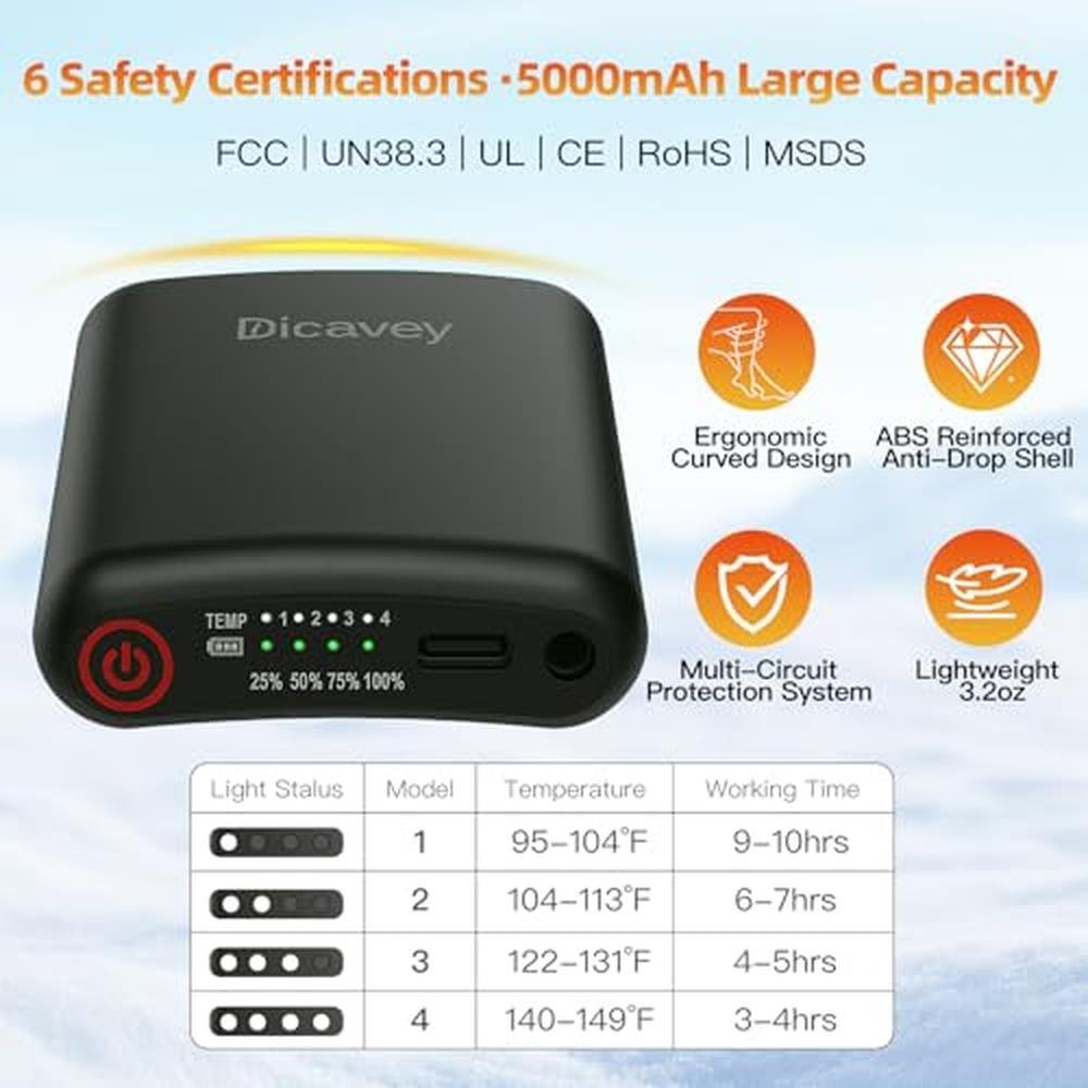 - CURVED 5000MAH BATTERY COMFORTABLE & LONG-LASTING Ergonomic curved battery fits naturally along the calf, reducing foreign body sensation and allowing freedom of movement. 5000mAh high-density capacity offers 410 hours of heat without bulk not too big, not too small.