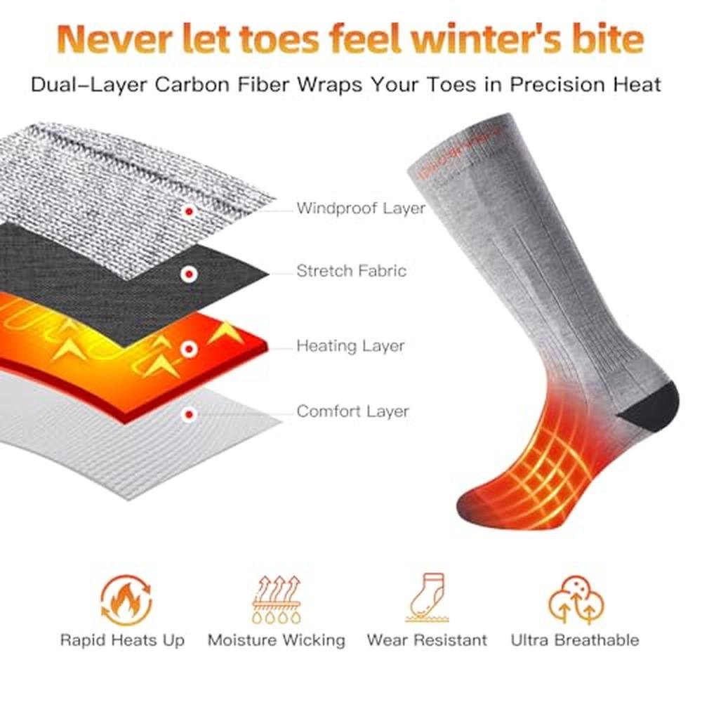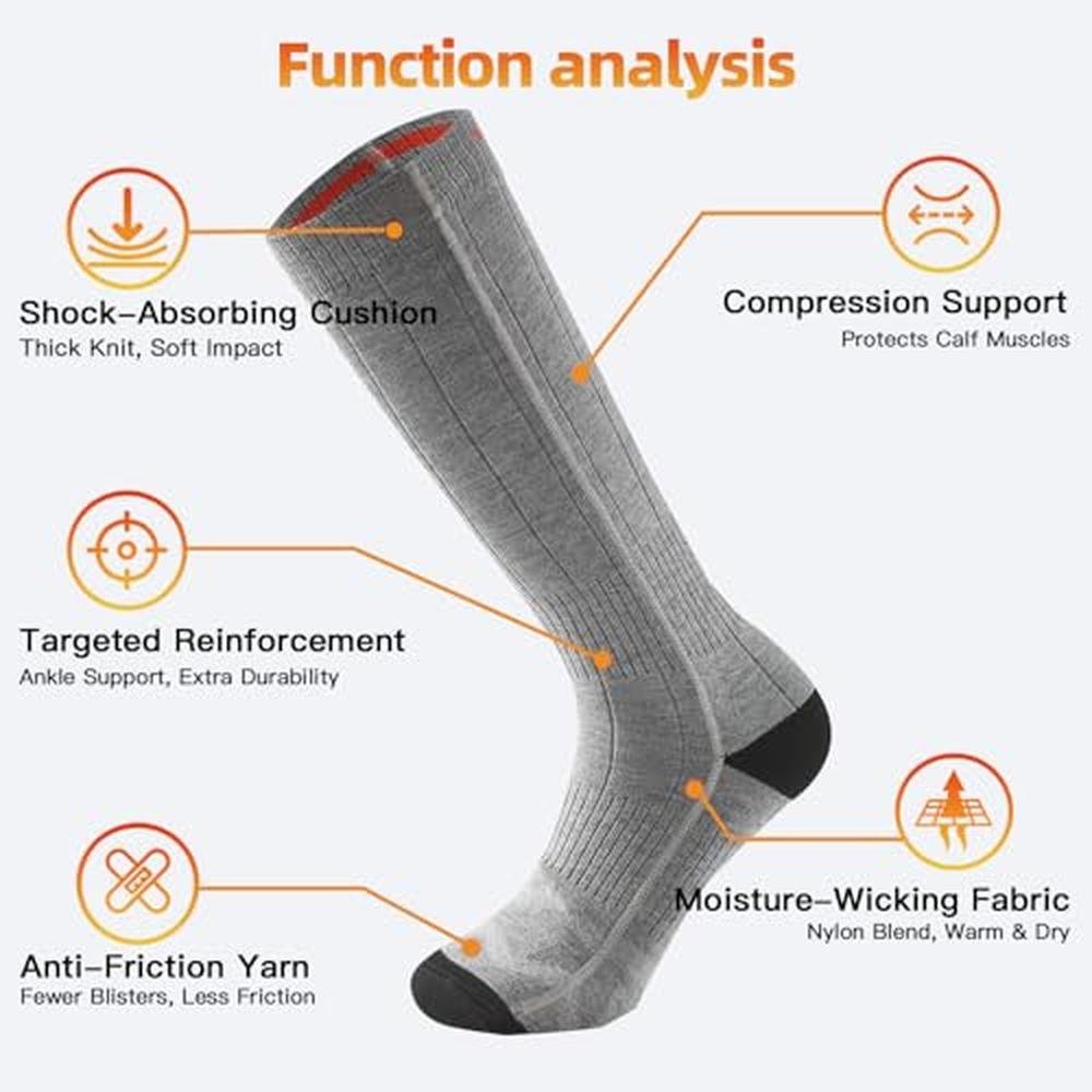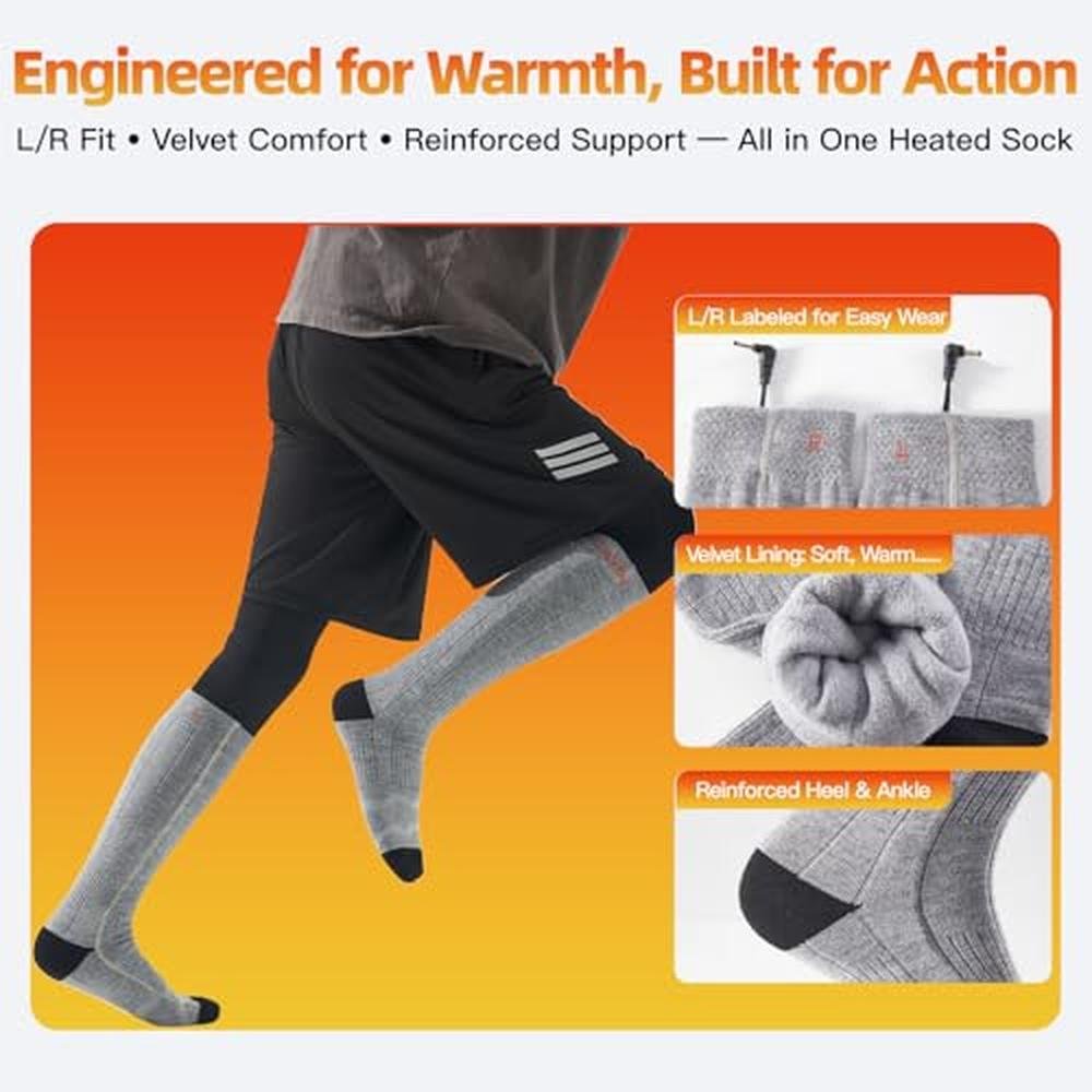 Stay warm and comfortable all winter with our advanced Heated Socks, designed for both men and women. These socks feature a high-capacity 5000mAh curved battery that delivers up to 10 hours of consistent warmth. Perfect for outdoor work, winter sports, and anyone who suffers from chronically cold feet. **Smart Heating Technology:** With 4 adjustable heat levels, our socks warm up in just 30 seconds and maintain stable temperatures across the foot using a multi-layer composite heating wire system. **Comfort Meets Performance:** Made from high-stretch fabric, one size fits US size 6-14. The velvet lining, moisture-wicking modal blend, and shock-absorbing stripes keep your feet dry, supported, and blister-free. **Built for the Cold:** The durable ABS battery case, hidden battery pocket, reinforced heel/toe, and anti-slip compression cuff ensure these socks perform in even the harshest environments. **Safe & Certified:** Includes FCC, UL, CE, ROHS, MSDS, and UN38.3 certifications. Machine washable and easy to maintain. Ideal for skiing, hiking, camping, hunting, fishing, cycling, or simply staying cozy at home. Warmth starts from the ground up.