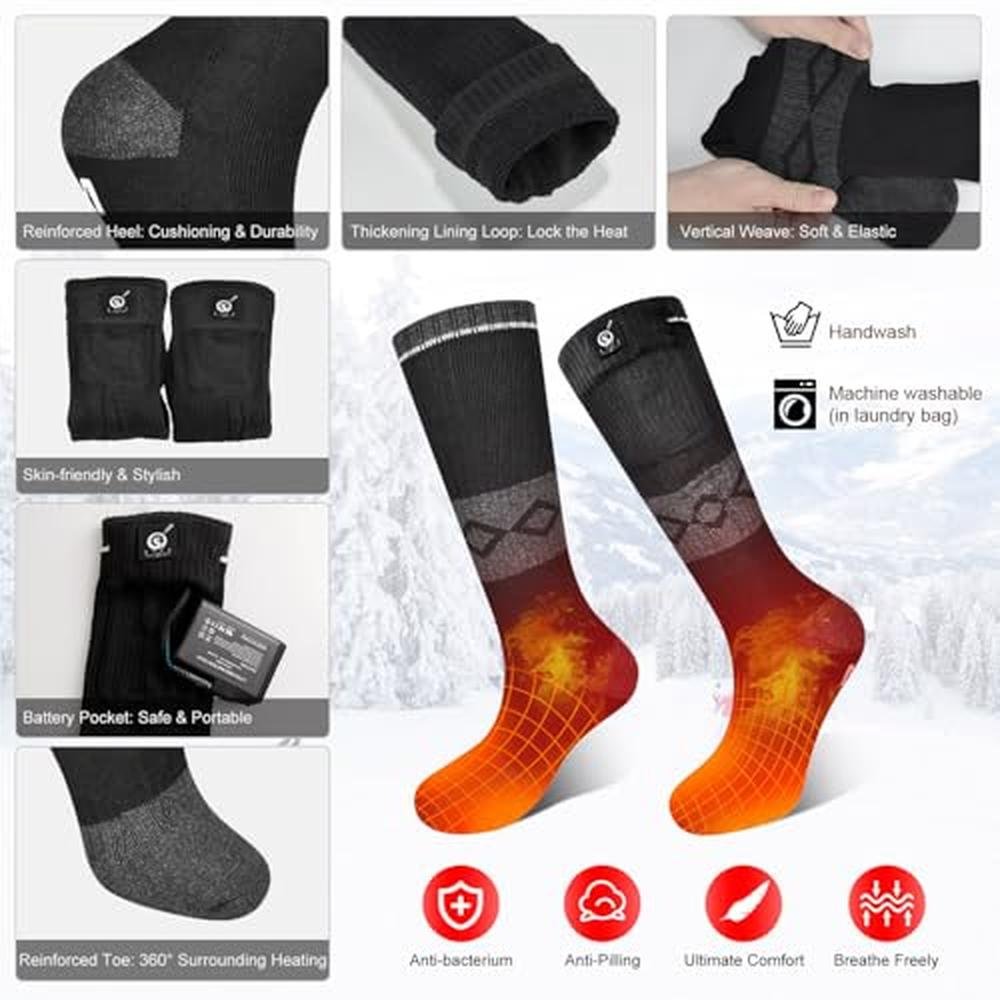 - Heating Elements Covers Instep and Toes AreaUpgraded heated socks to use fiber heating elements all around both fore foot and instep. Great for cold feet.Give you a warm winter!