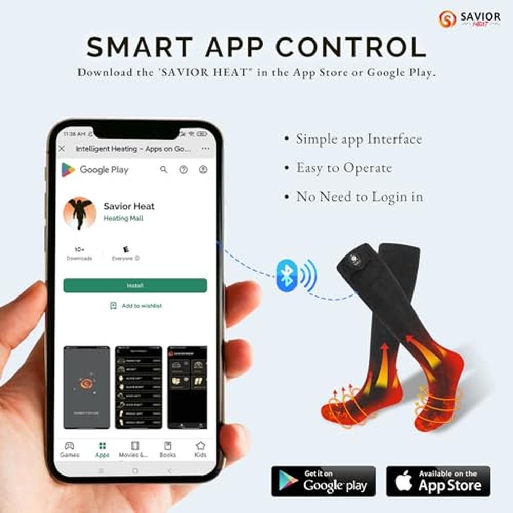 - APP Control & Button ControlSAVIOR HEAT Rechargeable Heated Socks include a Bluetooth remote app to control the temperature settings of the warm socks, so you dont have to hike up your pant legs to find the on/off button in frigid weather. You also can use switch button to adjust the heating level,the function is conveniently straight forward,all you do is press the button to turn it on, then adjust the temperature as needed