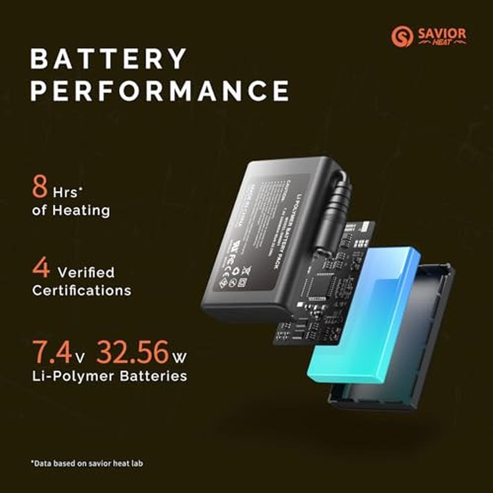 - 7.4V 32.56W Rechargeable Battery Compared with others' 5v 5000mah battery powered socks, Savior heat's 7.4V battery heated socks have higher power and current, which makes them 25% warmer and last 25% longer time
