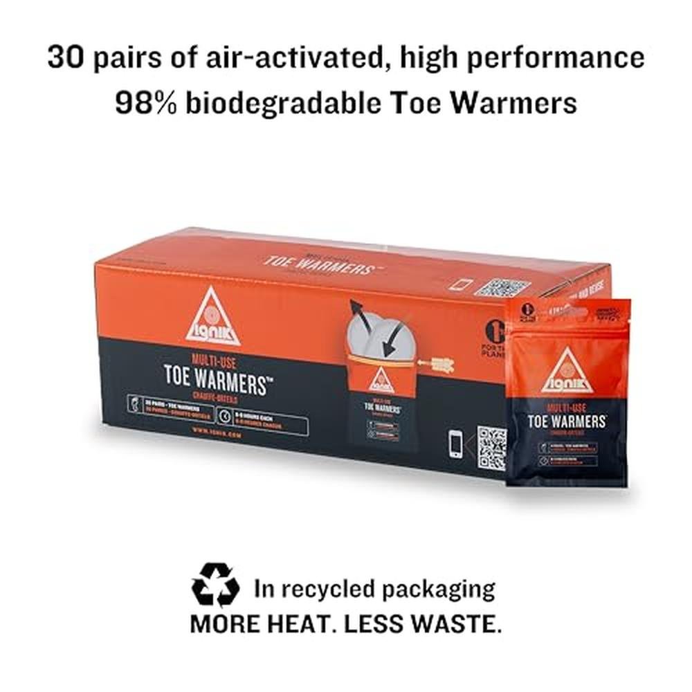 More Heat, Less Waste. Ignik 8-Hour Compostable, Reusable High-Performance Toe Warmers are made from biodegradable materials, and come in recyclable packaging for more heat, with less waste. Each air-activated, adhesive warmer provides 6-8 hours of heat, while the reusable AirBarrier Pouch, which minimizes air permeability, can save unused warmer heat for up to 72 hours, for intermittent use. Ignik heat is provided by 98 percent biodegradable natural minerals, combined with oxygen, and the contents of the warmers can be composted after use. Ideal for camping, hiking, hunting, snowshoeing, skiing, dog walking, and other cold weather outings, Igniks ultra-efficient warmers are easily activated by removing them from the packaging and exposing them to air. Each adhesive warmer measures 2.8 x 4 inches, and fits easily inside a boot, shoe, or slipper, either on top of or under the toes. Ignik 8-Hour High-Performance Toe Warmers are available in packs of 10 pairs, 20 pairs, 30 pairs, or 50 pairs.
