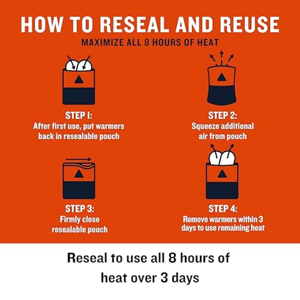 - Each warmer provides 6-8 hours of heat; reusable AirBarrier Pouch minimizes air permeability can save unused warmer heat for up to 72 hours, for intermittent use
