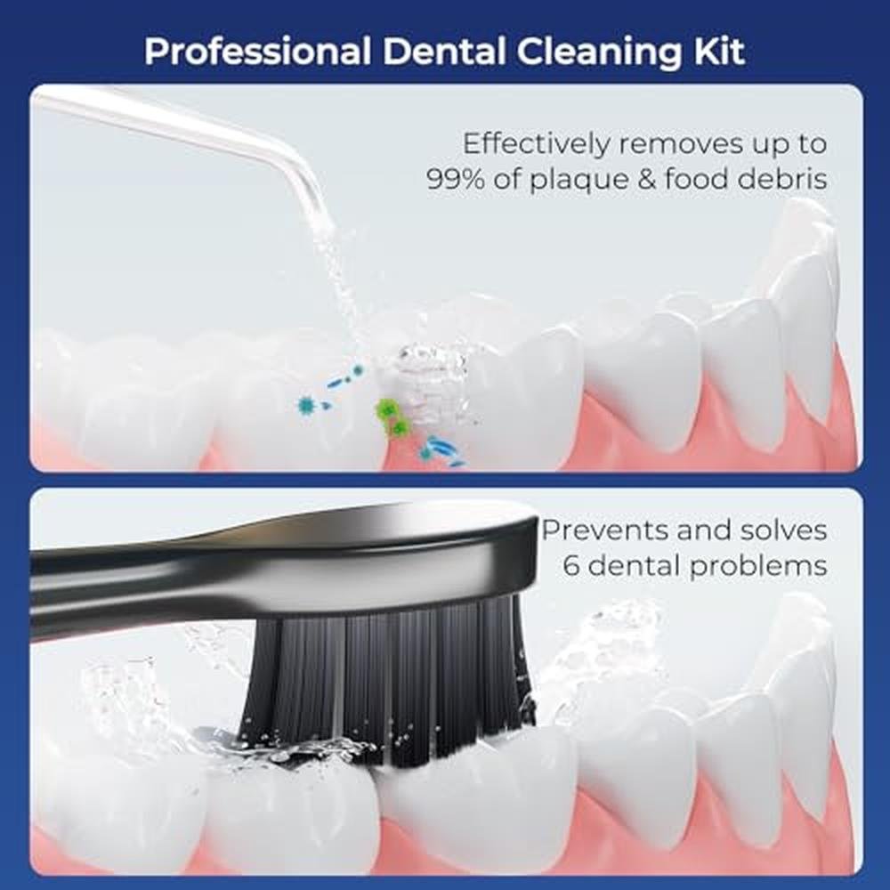 Experience the ultimate in teeth cleaning and flossing with the KUEIOX Electric Toothbrush and Water Flosser. This innovative device features 5 customizable modes, 6 precision jet tips, and an IPX7 waterproof design for convenient and effective use. With a 320ML portable water tank, you can enjoy up to 30 seconds of continuous flossing, perfect for removing plaque, debris, and even tonsil stones. The KUEIOX Oral Cleaning Kit in combination cleans the deep plaque between the teeth and below the gum line where traditional brushing and flossing can't reach. It improves your oral health so you can enjoy a clean, fresh mouth.