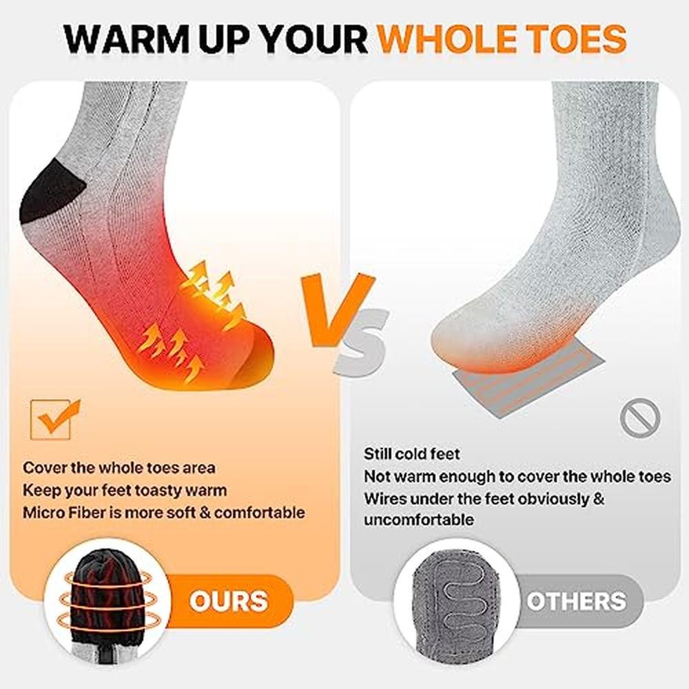 - Warm Up Whole Toes in 30sRechargeable heated socks rapidly heat up within 30s, cover the back of the feet and the whole toe area, and spread throughout the whole foot, keeping your feet warm and cozy.