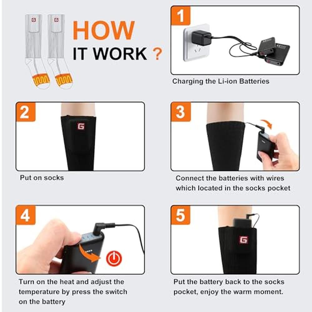 | Included Components | 1 pair heated socks, 2pcs 3.7V 4000mAh batteries, 1pc usb charge cable,1pc user manual. |