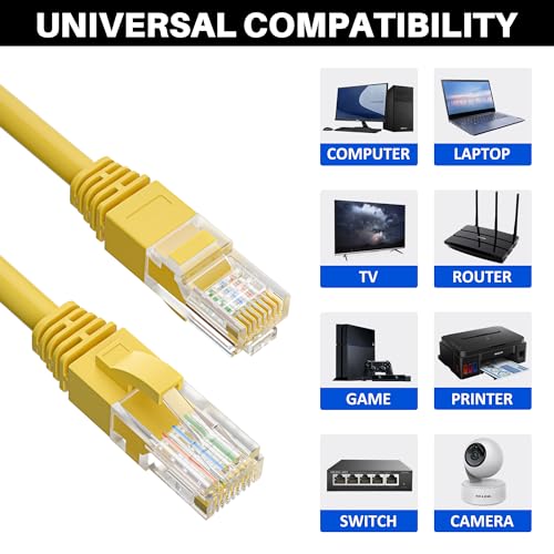 Experience reliable and fast internet connectivity with our 125 FT Cat5e Ethernet Cable, designed to deliver exceptional performance and durability for your home network, office, or outdoor use. With a maximum length of 125 feet, this long Cat 5e internet cable is perfect for connecting devices such as PCs, servers, routers, modems, TVs, and gaming consoles like PS5, while supporting Power over Ethernet (PoE) for convenient power delivery. Our Cat5e cable boasts a speed performance of up to 1000 Mbps and a bandwidth capacity of 100 MHz, making it ideal for streaming, online gaming, and heavy internet usage. The yellow snagless patch cord features a standard RJ45 connector and comes with 15 cable ties for easy organization. High Speed Cat 5e Ethernet Cable provides lag-free data transfer speeds of up to 1.0Gpbs and a bandwidth of up to 350MHz. Our premium materials include 4 twisted pairs of solid CCA copper clad conductors and gold-plated RJ45 connectors for optimal performance and durability.