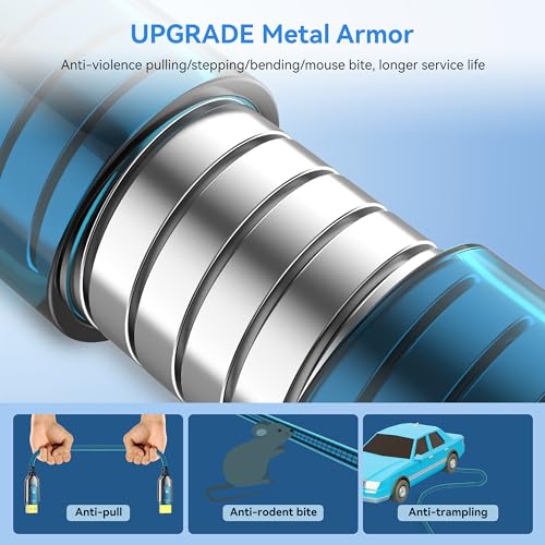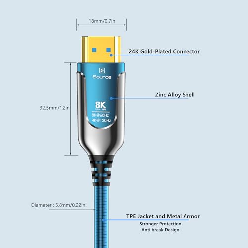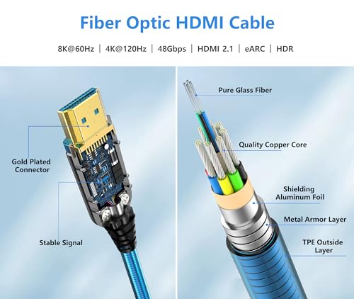 Explore the limitless possibilities of our UPDATED 30 Ft Fiber Optic HDMI 2.1 Cables, boasting 8K 48Gbps and metal armored protection. The metal armored tube and outer TPE jacket ensure flexibility and durability, making them suitable for both indoor and outdoor use. Our 8K Ultra High Speed HDMI Cable supports 48Gbps, 8K60Hz, and 4K120Hz, guaranteeing an active HDMI to HDMI connection from source to display. Please note the direction of use before connecting. Our cables are compatible with all HDMI devices, including Blu-ray players, PC, HDTV, laptop, monitor, projector, or large display.