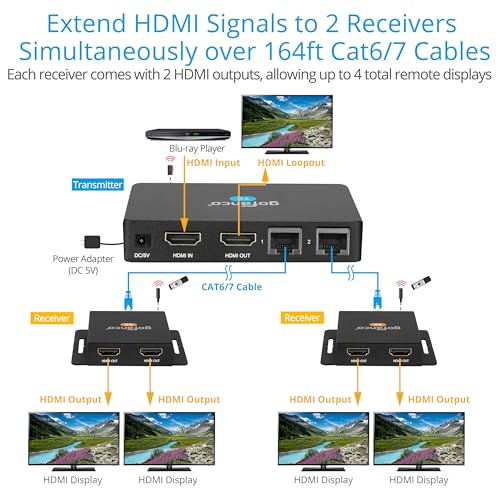 Experience the ultimate in HDMI signal extension and splitting with the gofanco 1080p 1x2 HDMI Extender Splitter Over CAT6/7, a premium solution designed for high-end applications where a single HDMI source needs to be distributed to multiple displays. This advanced device is perfect for home theaters, conference rooms, or digital signage, offering pristine 1080p resolution at 60fps and extending up to 164ft (50m) while maintaining high-quality video transmission. With its dual HDMI outputs on each receiver, HDCP 1.4 compliance, and Power over Cable (PoC) functionality, this extender splitter ensures reliable and high-quality video transmission. Additionally, it features EDID management, loopout, IR extension, and low latency, making it an ideal choice for those seeking a superior viewing experience.