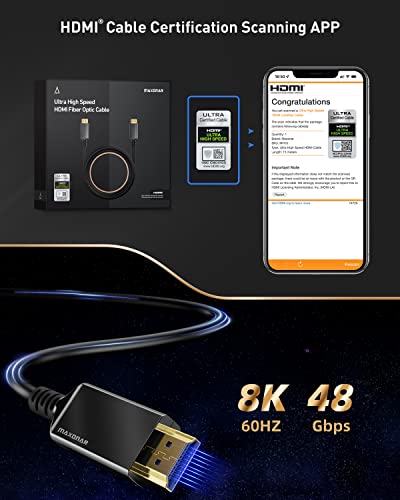 Cable Maxonar | Maxonar 8K Fiber Optic HDMI Cable 50ft | Ultra-High-Speed 8K60 4K120 144Hz Certified