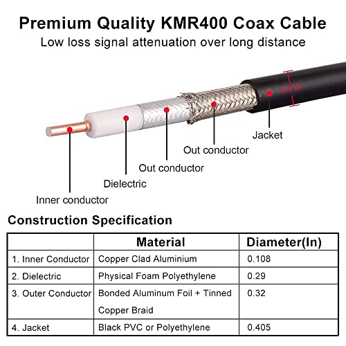 - With 50ohm impedance and KMR400 coaxial cable construction, this cable minimizes signal degradation for high-frequency transmissions