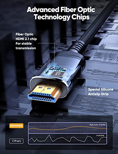 Immerse yourself in the world of high-definition video and audio with the Snowkids 8K HDMI Fiber Optic Cable, expertly designed to deliver exceptional performance and reliability. As a premium choice for those seeking a high-end fiber optic solution, this 100FT/30M long, unidirectional cable supports ultra-high speeds of up to 48Gbps, making it perfect for 8K60 and 4K resolutions. With its sophisticated braided design and enhanced Audio Return Channel (eARC) capability, this HDMI cord is compatible with the latest technologies, including HDR10 and versions 2.2 and 2.3 of the HDMI specification. Whether you're connecting your TV, monitor, PS-5, X-box, or sound system, experience the ultimate in high-definition video and audio with the Snowkids 8K HDMI Fiber Optic Cable.