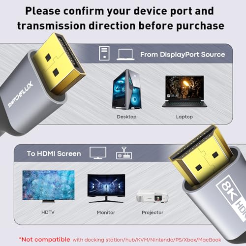 DisplayPort Switchflux | SWITCHFLUX 6FT DisplayPort to HDMI 8K Cable | 8K@60Hz Uni-Directional DP Source to HDMI Display