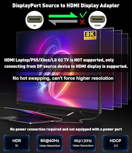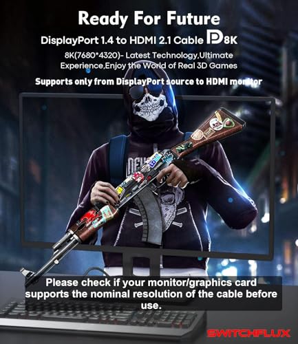 Immerse yourself in unparalleled video quality with the SWITCHFLUX 6FT DisplayPort to HDMI 8K Cable, expertly designed to deliver seamless connectivity between your DisplayPort 1.4 source device and HDMI 2.1 display. This premium, high-end, uni-directional cable supports resolutions up to 8K@60Hz, 4K@120Hz, and 2K@144Hz, making it perfect for gaming, graphics design, and video editing applications. Compatible with AMD and NVIDIA graphics cards, the SWITCHFLUX DisplayPort to HDMI cable ensures a stable and high-speed connection. With its braided cord design, this cable is not only durable but also resistant to interference, providing a superior viewing experience. Whether you're looking for a reliable connection for your desktop computer, notebook, or graphics card, the SWITCHFLUX DP 1.4 to HDMI 2.1 cable adapter easily transfers high-definition video and audio signals for video streaming or gaming.
