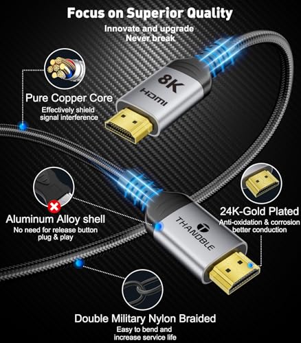 Immerse yourself in the ultimate high-definition video and audio experience with the THANDBLE 8K 10K HDMI 2.1 Cable, expertly designed to deliver unparalleled performance and compatibility. As a premium supplier of high-quality cable thandble solutions, we offer a 5-pack of 3FT braided cords that support ultra-high speeds of up to 48Gbps, making them perfect for various cable thandble uses such as gaming and video streaming. With support for 4K@120Hz/144Hz and 8K@60Hz, as well as DTS:X, eARC, and HDR 10, these cables ensure a superior viewing experience. The gold-plated connectors provide optimized performance and corrosion resistance, while the high-quality aluminum alloy offers excellent heat dissipation. This ultra HD cable supports resolutions up to 8K60Hz, allowing you to stream 8K content from laptops and tablets to more displays, giving you higher-quality content.