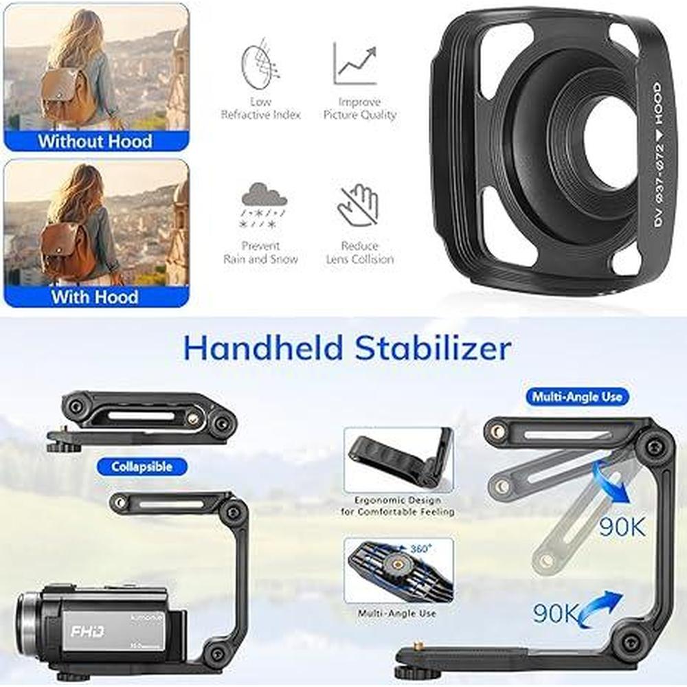 Indulge in the world of video recording with our Kimonie FHD 1080P camera camcorder, which offers a range of features including IR Night Vision, Face Detect, and Anti Shake. The camera's time-lapse recording function allows you to slow down fast-moving objects, while the lens hood blocks excess light and protects the camcorder lens from accidental damage.