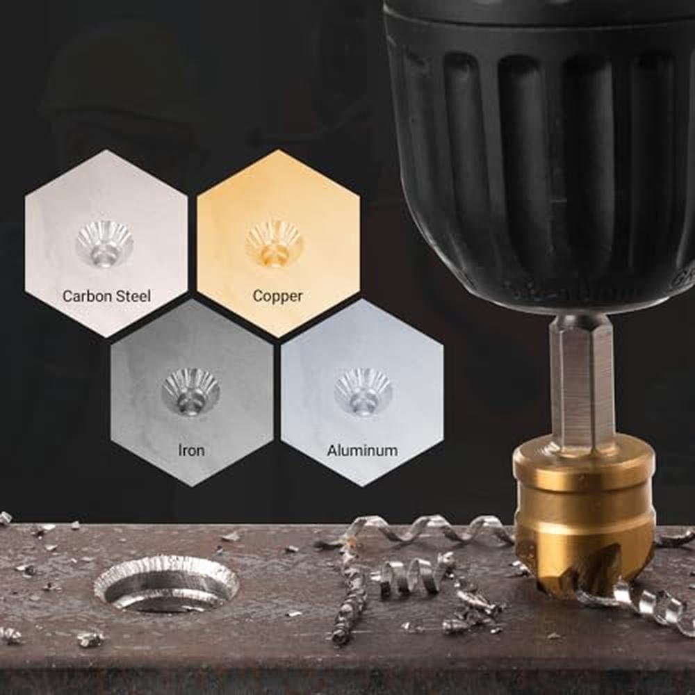 The countersink drill bits are crafted from high-quality M35 cobalt high-speed steel, providing double protection fortified with a cobalt coating for enhanced durability, corrosion resistance, and heat resistance. The five-flute design offers superior stability during cutting and efficient debris discharge, extending the blade life and ensuring accurate cuts. The set includes 6 popular sizes, making it suitable for a wide range of applications, including stainless steel, carbon steel, iron, copper, aluminum, and most other metals, as well as wood, plywood, and other materials. The laser-engraved step sizes ensure clear visibility and durability during use, enhancing convenience and accuracy.