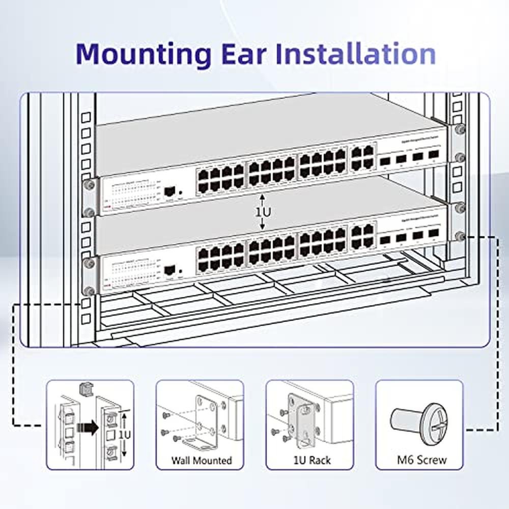 • Package Included Each kit contains 2 rack mount ears, 8 sets of switch screws(M3 M4), 4 sets of cabinet kits (screws snaps). Good for switch rack mounting needs or kit replacement.