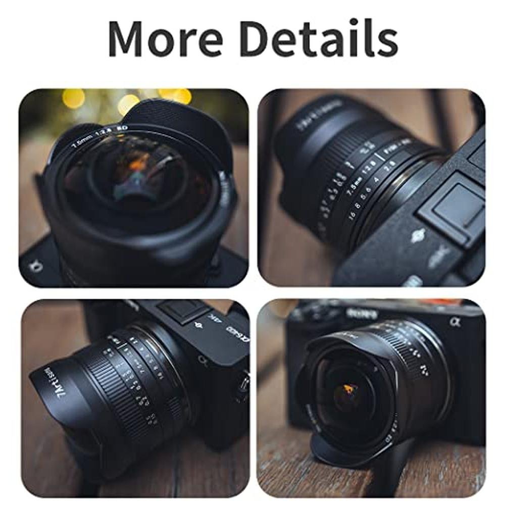 wide compatibility: for Sony Cameras: A7, A7II, A7R, A7RII, A7S, A7SII, A6500, A6300, A6000, A5100, A5000, NEX-3, NEX-3N, NEX-3R, NEX-C3, NEX-F3K, NEX-5, NEX-5N, NEX-5A, NEX-5T, NEX-5C, NEX-5K, NEX-5R, VG10, VG20, VG30, EA50; SpecificationModel:7artisans 7.5mm-F2.8 II LensFull frame available: No, APS-C fisheye lensFocus Scale: F2.8-16Closest focus distance: 0.15mAperture angle: 190 degreeLens Length: 55mmBlades Number: 7 diaphragm bladesConstruction: 11 elements in 9 groupsCoating: UMCLength: 62.3mmWeight: 265g Package1x 7.5mm-F2.8 II Lens1x Front Lens Cap1x Rear Lens Cap1x User manual1x Lejous Cleaning Cloth