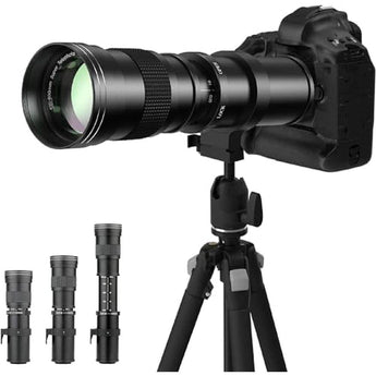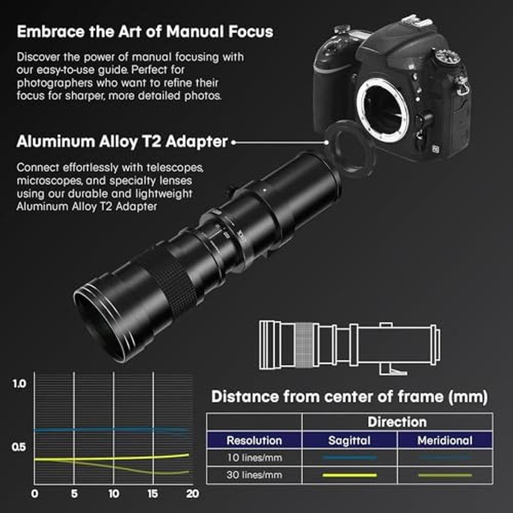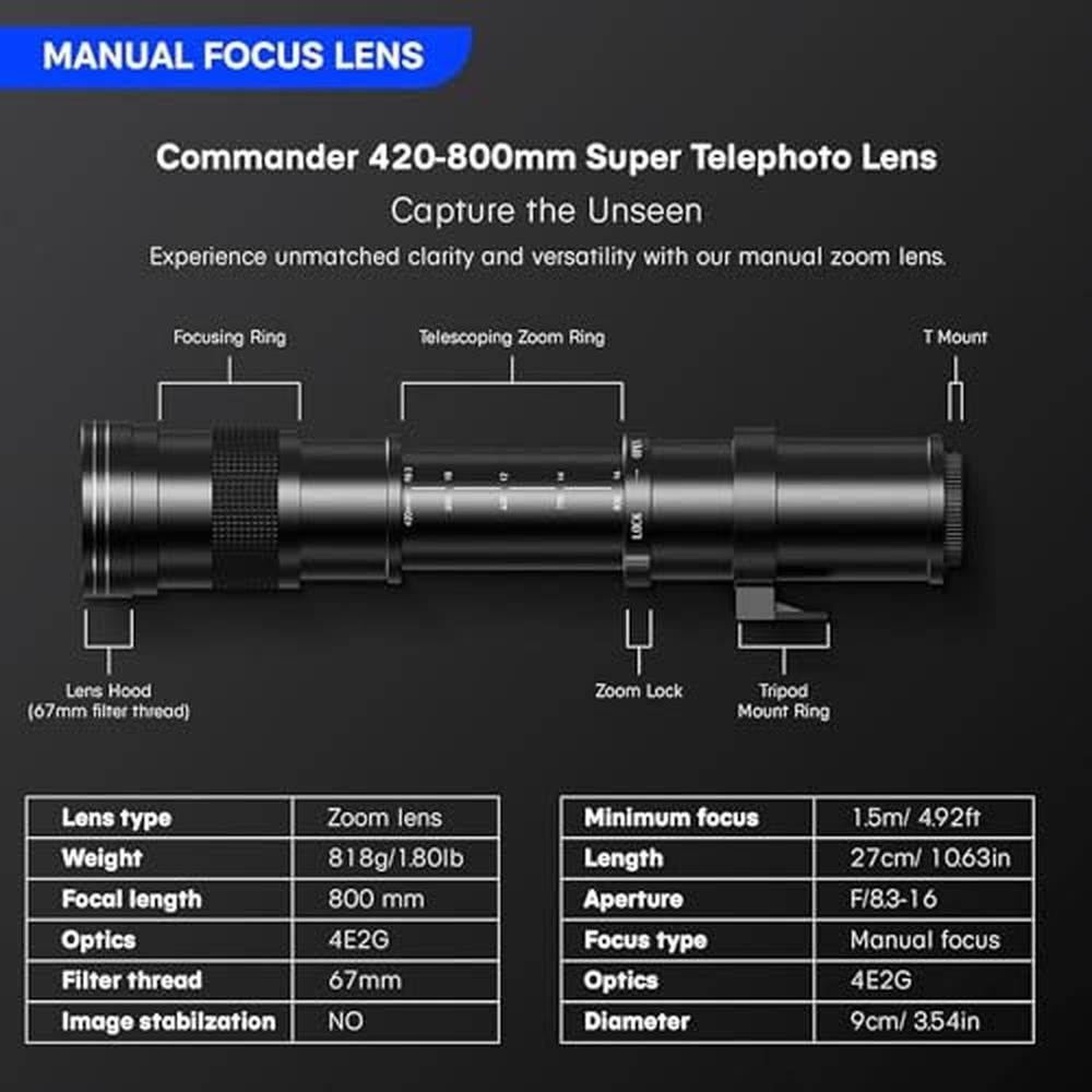 COMMANDER OPTICS 420-800mm f/8.3 Manual Telephoto Zoom Lens With T Mount Elevate your photography to professional standards with unparalleled image quality. Crafted with precision optics and cutting-edge coatings, this lens captures the essence of your subjects with stunning clarity and lifelike colors. Say goodbye to distortion and hello to sharp, detailed imagery that leaps off the screen or print. Immerse yourself in precision with full manual control over aperture, focal length, and focus. This hands-on approach empowers you to tailor each shot to perfection, ensuring that every image reflects your unique creative vision with precision and finesse, all while benefiting from advanced UMC technology for exceptional clarity in any lighting condition. Dive into the realm of creative possibilities with a focal range spanning from 420mm to an impressive 800mm. Whether you're capturing wildlife on the savannah or distant cityscapes, this lens brings your subjects closer with remarkable clarity and detail. And with a minimum focusing distance of just 1.5 meters, even the tiniest details are within your grasp. Embrace the rugged durability of full metal construction, designed to withstand the rigors of professional use. Fine-tune your compositions with ease using the adjustable zoom and manual focus features, giving you the ultimate control over your photographic vision. From sweeping landscapes to intimate portraits, this lens is your passport to endless creativity and unforgettable imagery.