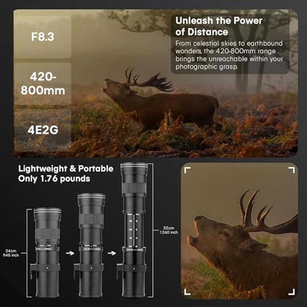 - HIGH POWER TELEPHOTO LENS: This 420-800mm Lens, A must have long range lens for your Sony camera, is designed for capturing clear long distance camera shots, providing enhanced photographic flexibility. This premier long range lens allows photographers to capture sports & wildlife like never seen before.