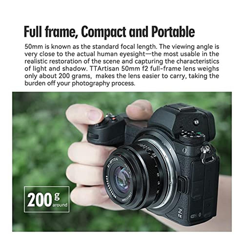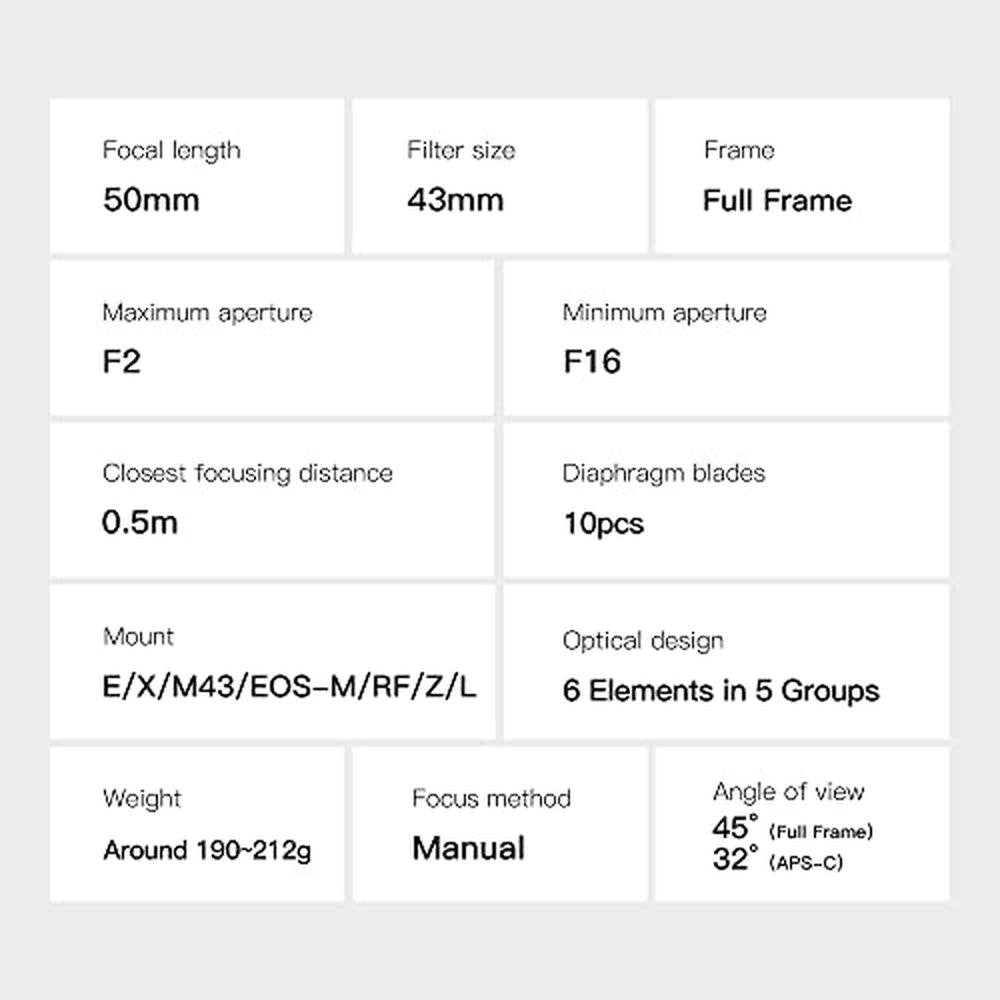 TTArtisan 50mm F2 Lens--Specifications:* Lens Model: 50mm F2* Frame Type: Full Frame* Optical Design: 6 Elements in 5 Groups* Diaphragm Blades: 10pcs* Weight: Around 190-212g* Lens Size: 60mm*35mm(Different mount will have little difference)* Focus Method: Manual* Closest Focusing Distance: 0.3m* Angle of View: 45(Full Frame);32(APS-C)* Filter Size: 43mm* Compatible Mount: E/X/M43/EOSM/RF/Z/L-- Features:* Full Frame: Compact and Portable: TTArtisan 50mm F2 weighing only about 200g, easy and convenient to carry around, takeing the burden off your photography process.* F2 Large Aperture: With F2 large aperture, lens can perfom well in low-light environments. Also, it can create a beautiful bokeh.* 50mm Focal Length: 50mm is known as the standard focal length. The viewing angle is very close to the actual human eyesight. Everyone who own a camera, always have a 50mm focal length lens.
