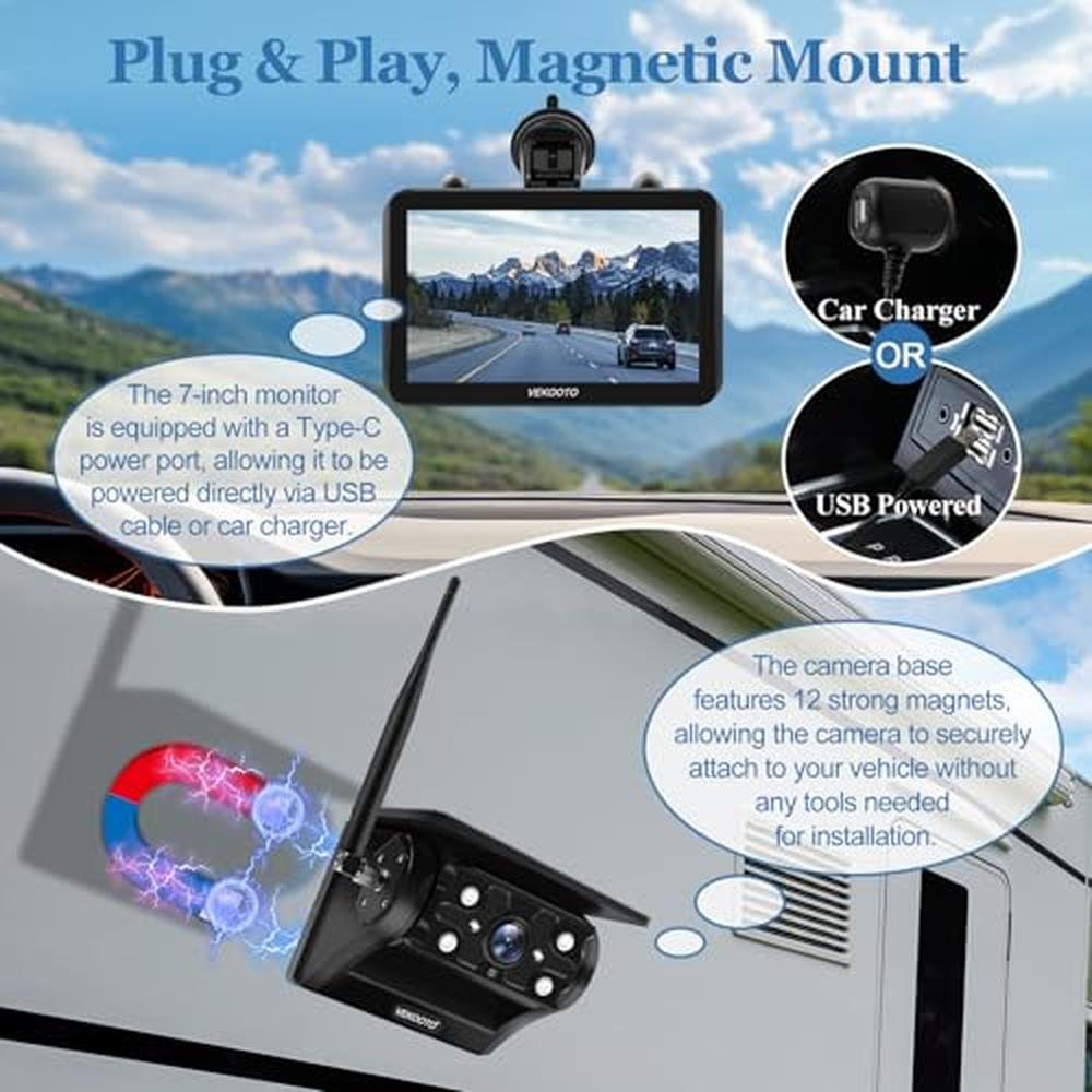 Experience enhanced safety and convenience on the road with the VEKOOTO VK7-2 Magnetic Solar Wireless Backup Camera, designed specifically for trucks, RVs, trailers, campers, and more. As a top-rated backup camera solution, this wireless system offers a 7'' IPS touchscreen display and 1080P night vision capabilities, ensuring clear visibility in all conditions. The wireless backup camera features a long-lasting 15,000mAh rechargeable battery, auto sleep mode, and no wiring required for a hassle-free installation. With its advanced technology and premium-grade components, this backup camera provides a superior driving experience, allowing you to navigate through tight spaces and parking lots with confidence. Please charge the camera for 5-6 hours before use.
