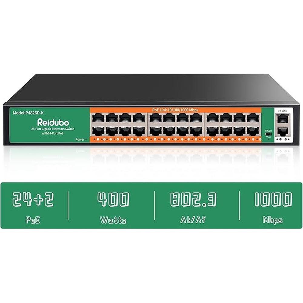 • Enjoy reliable and efficient power delivery with our 400W PoE switch, boasting advanced features such as VLAN and 802.3af support, ideal for powering AP WiFi6 PoE cameras and other devices.