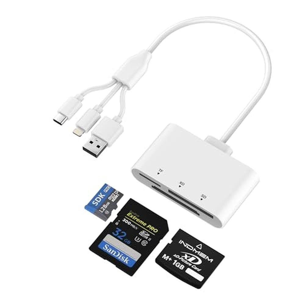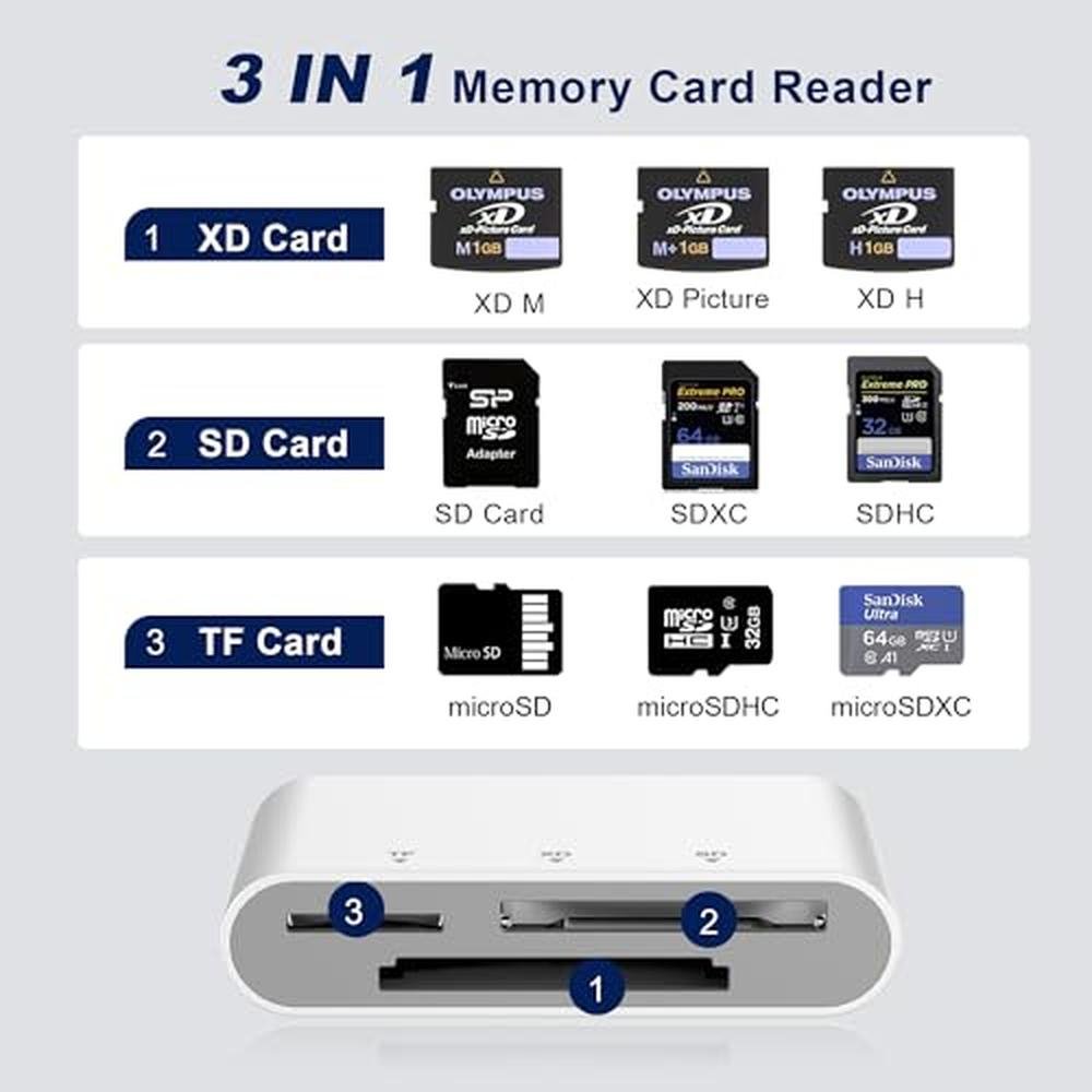 3-in-1 SD Card Reader for iPhone with Lightning/USB-C/USB-A - XD,SD,MicroSD Memory Card Adapter up to 2TB, Compatible with iPhone 16/15/14, iPad, Android, MacBook,PC,Camera & Drone