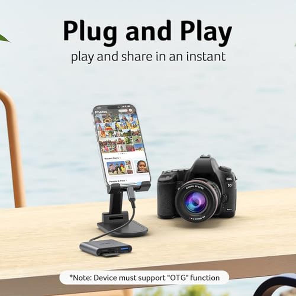 - 3-in-1 Card ReaderThe USB C SD Card Reader features dual card slots and a USB 3.0 port, enabling simultaneous data transfer from SD, microSD, and USB devices at up to 5Gbps. Transfer photos, videos, and files fastno need to swap devices(Note:Thick cases may prevent full insertion