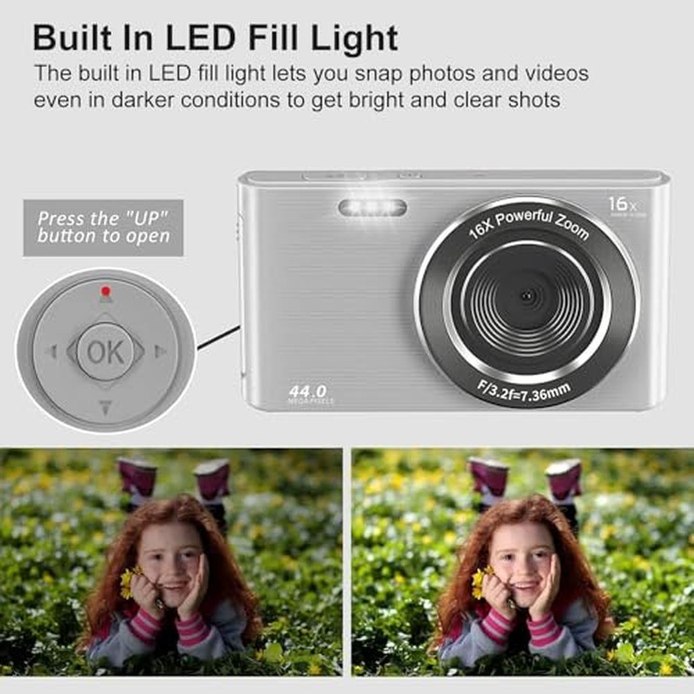 - 44MP 4K DIGITAL CAMERA This Digital Camera is perfect for kids, teens, and adults looking to explore photography. It captures high-resolution images with up to 44MP and records video in stunning 1080P Camera quality. Great for everyday moments or travel adventures, this Compact Small Camera supports 16X digital zoom, making it a top pick for those interested in cameras for photography or camaras fotograficas.