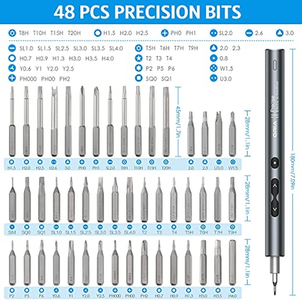 - 48 Screwdriver Bits: The bits made of S2 steel, hardness is over 60HRC. 48 units, 19 different bit types suitable for different needs, such as watch, camera, laptop, drone, home appliance, toys, smartphones, electronic, PS4, etc