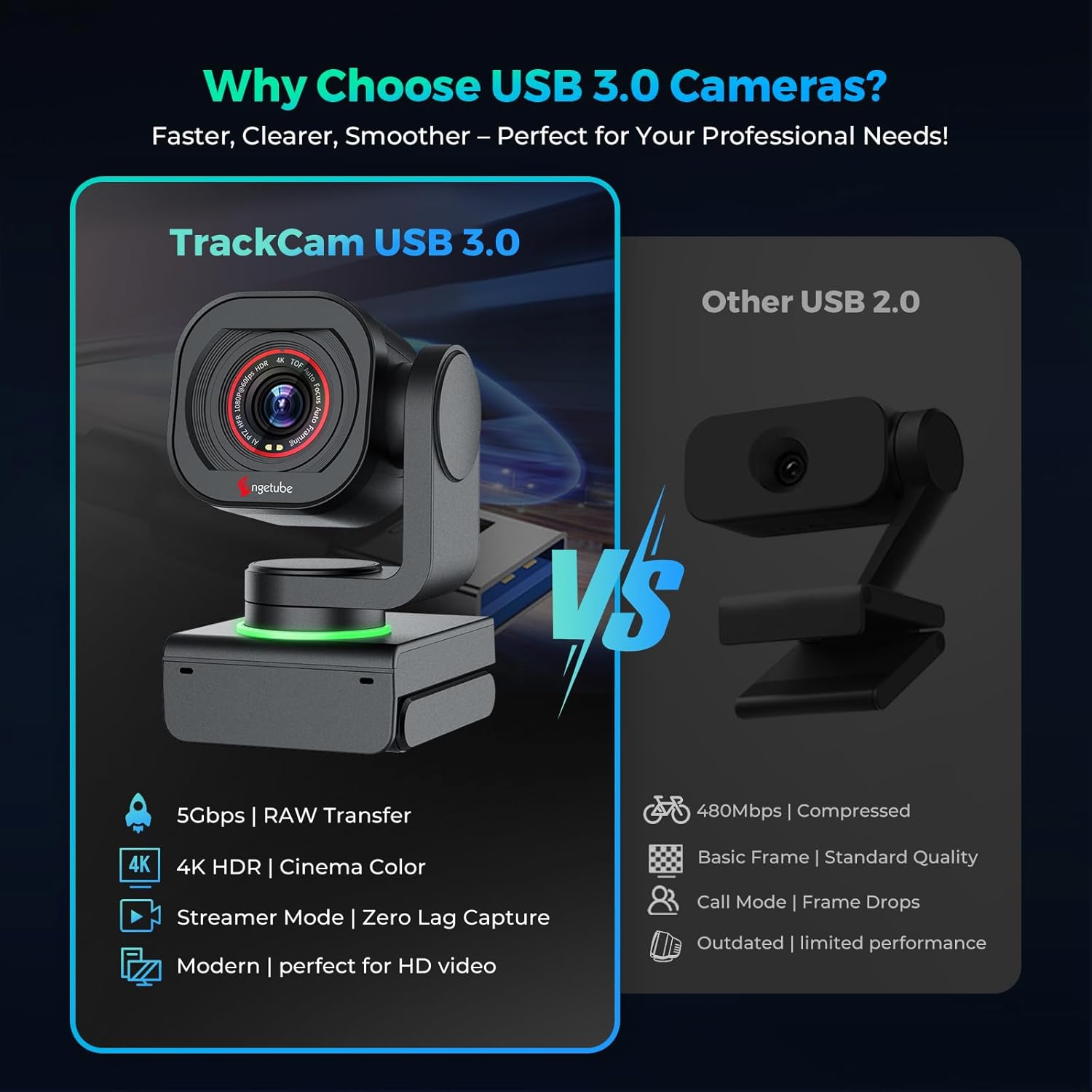 - 【High-Speed Transmission & Superior Quality】 4k webcam for pc equipped with a USB 3.0 port and USB 3.0 cable, the Angetube Trackcam 4k webcam delivers 10x faster data transfer for ultra-low latency and smooth video performance. Enjoy fully retained image details and true-to-life colors. Additionally, the webcam includes an independent power port and power cable to meet its energy requirements, eliminating concerns about insufficient power supply.