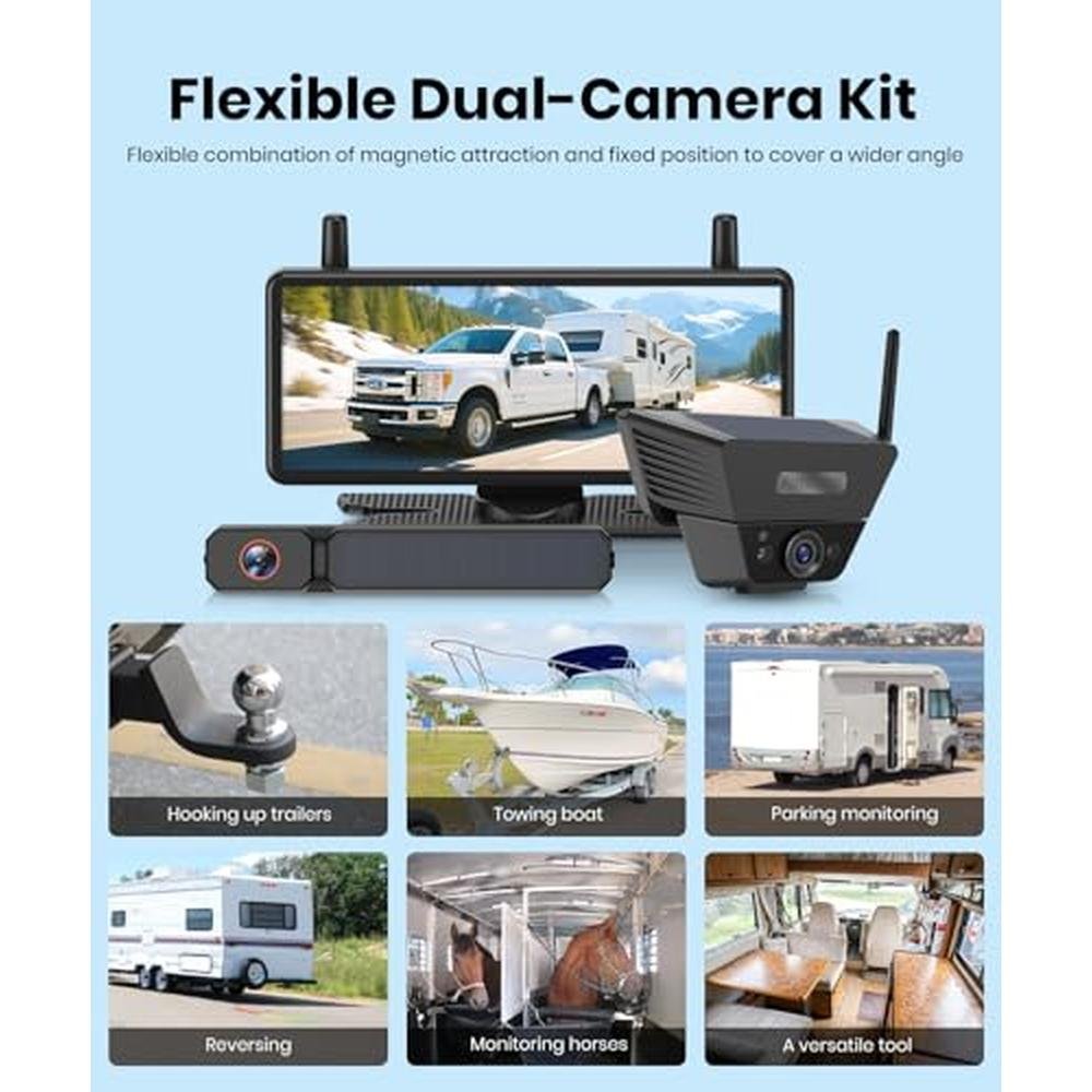 Solar-Powered Cameras Both cameras feature built-in solar panels that recharge while you drive. No frequent battery swaps needed, reliable for long cross-country RV trips, horse trailer hauls, or daily truck use.