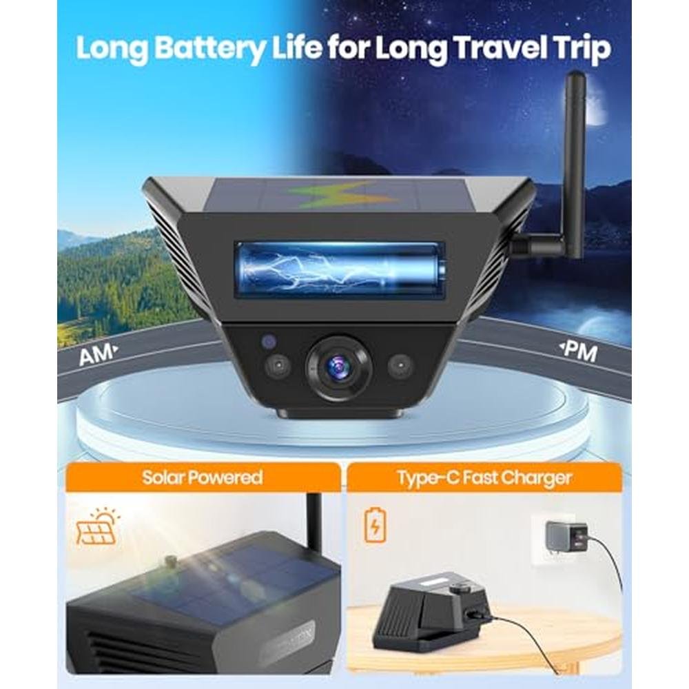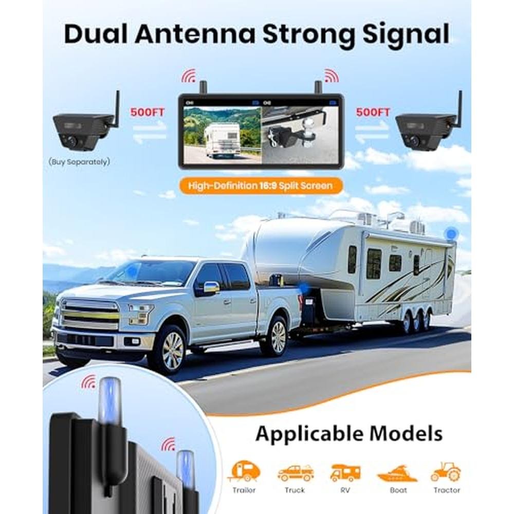 The system supports dual-channel split-screen with a second 170 wide-angle camera, allowing you to view both the trailer hitch and rear cargo simultaneously, ideal for monitoring environmental hazards. With solar power and an upgraded battery, it runs for up to 120 days per charge, and sleep mode reduces power consumption. The dual high-gain antenna ensures zero-latency signal and reliable performance up to 524ft, perfect for RV and truck drivers. Its IP69K waterproof rating ensures it can withstand extreme conditions, and features infrared night vision for safe reversing in darkness. DVR functionality with loop recording and 32GB memory card ensures critical evidence capture, and the system's compact storage bag makes it easy to transport.