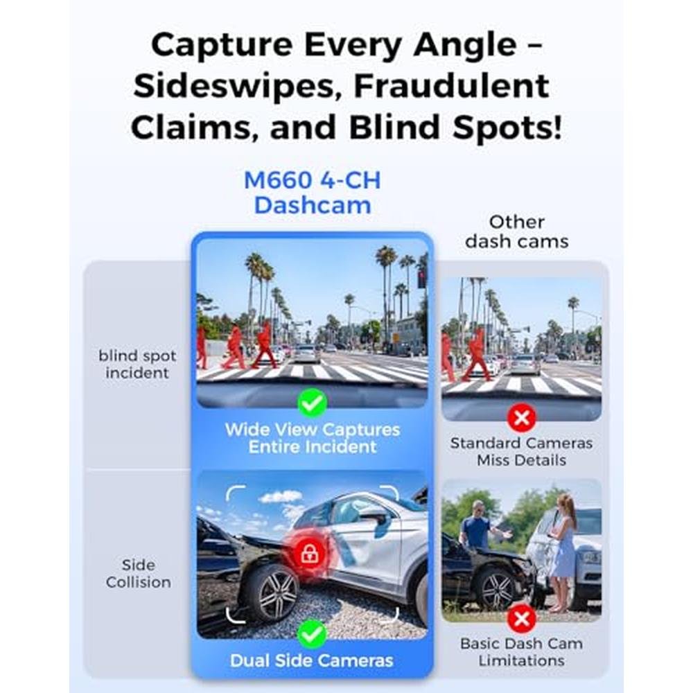 The M660 360 dash cam captures crystal-clear footage from the front, rear, and both sides of the driver's vehicle, providing complete evidence for incidents like vandalism, theft, parking scrapes, and insurance fraud, ensuring the driver is covered in any situation. This upscale dash cam is designed to deliver superior performance, advanced features, and unparalleled peace of mind, making it the ultimate choice for discerning drivers seeking a premium-grade driving experience.