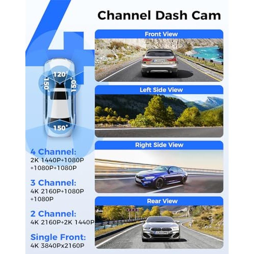 | Special features | 360 All Sides 4 Channel Dash Cam, 4 Adjustable Lenses, Built-In WiFi, Night Vision, No Memory Card Needed, Built-in 128GB eMMC Storage |